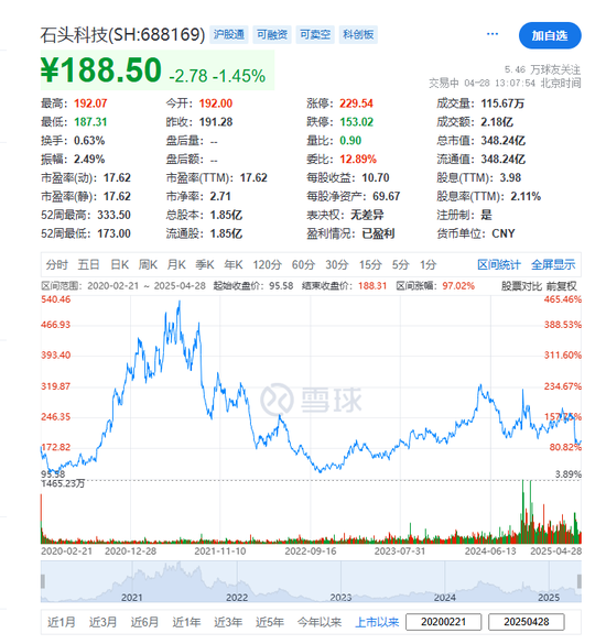 石头科技,于2020年2月21日在A股挂牌上市,截至发稿,每股报188.50元,目前总市值约348.24亿元。